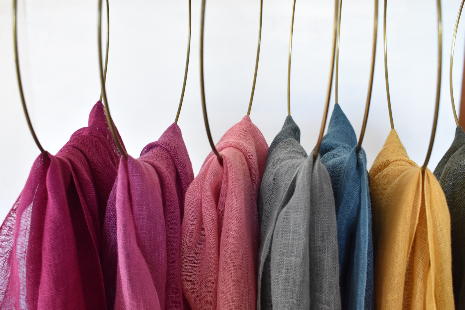 草木染めストールをオンラインショップに追加しました。珍しく15色も揃っています!グリーン系は手染めらしい染めムラがございます。ご了承くださいませ。