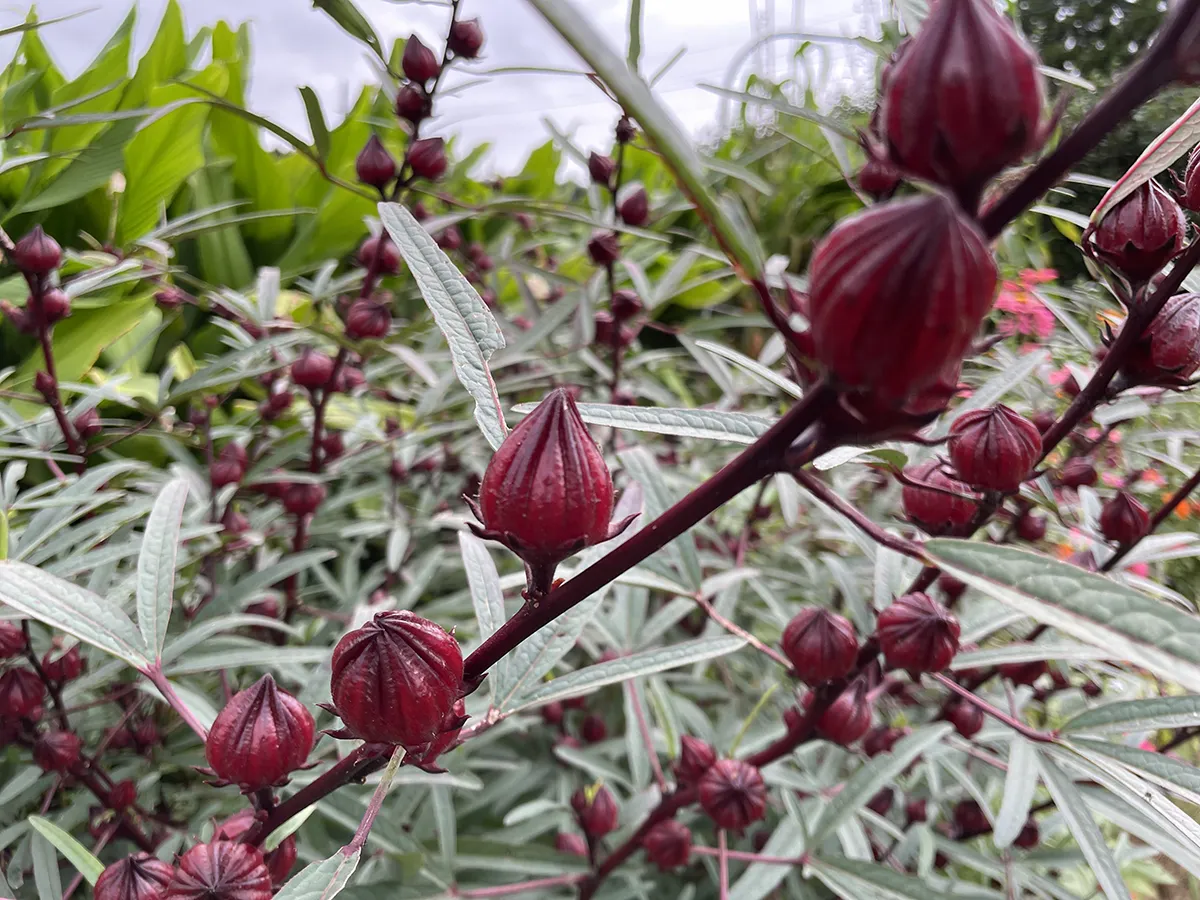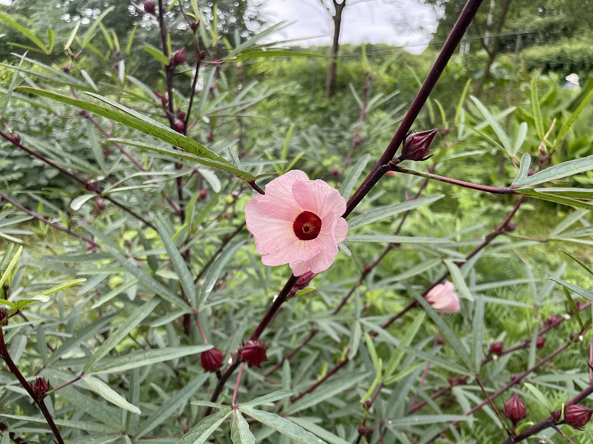 秋頃ピンク色の花が咲き、成熟した花のがくを乾燥させてハーブティーやジャム、塩漬けなどに!観賞用に枝ごと飾っても。
