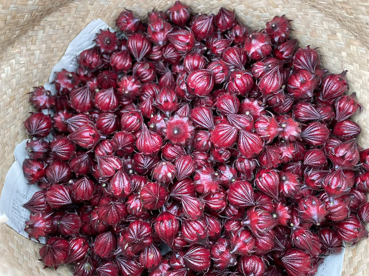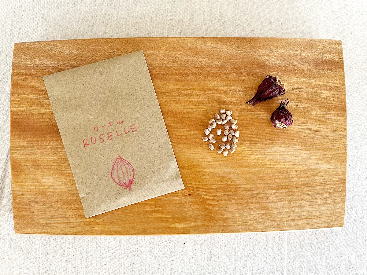 箱根山麓の畑で、農薬や肥料を使わずに自然の力で育てたローゼルの種です。1袋約30粒入りです。
